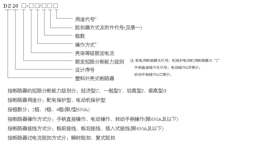 DZ2O系列塑料外殼式斷路器,適用于交流50Hz,額定電流從16A至2OOOA ,額定絕緣電壓660V ,額定工作電壓380V(400V)及以下的電路中作不頻繁的轉換和電動機不頻繁的起動之用。斷路器具有過載、短路和欠電壓保護裝置,能保護線路和電源設備不受損壞。